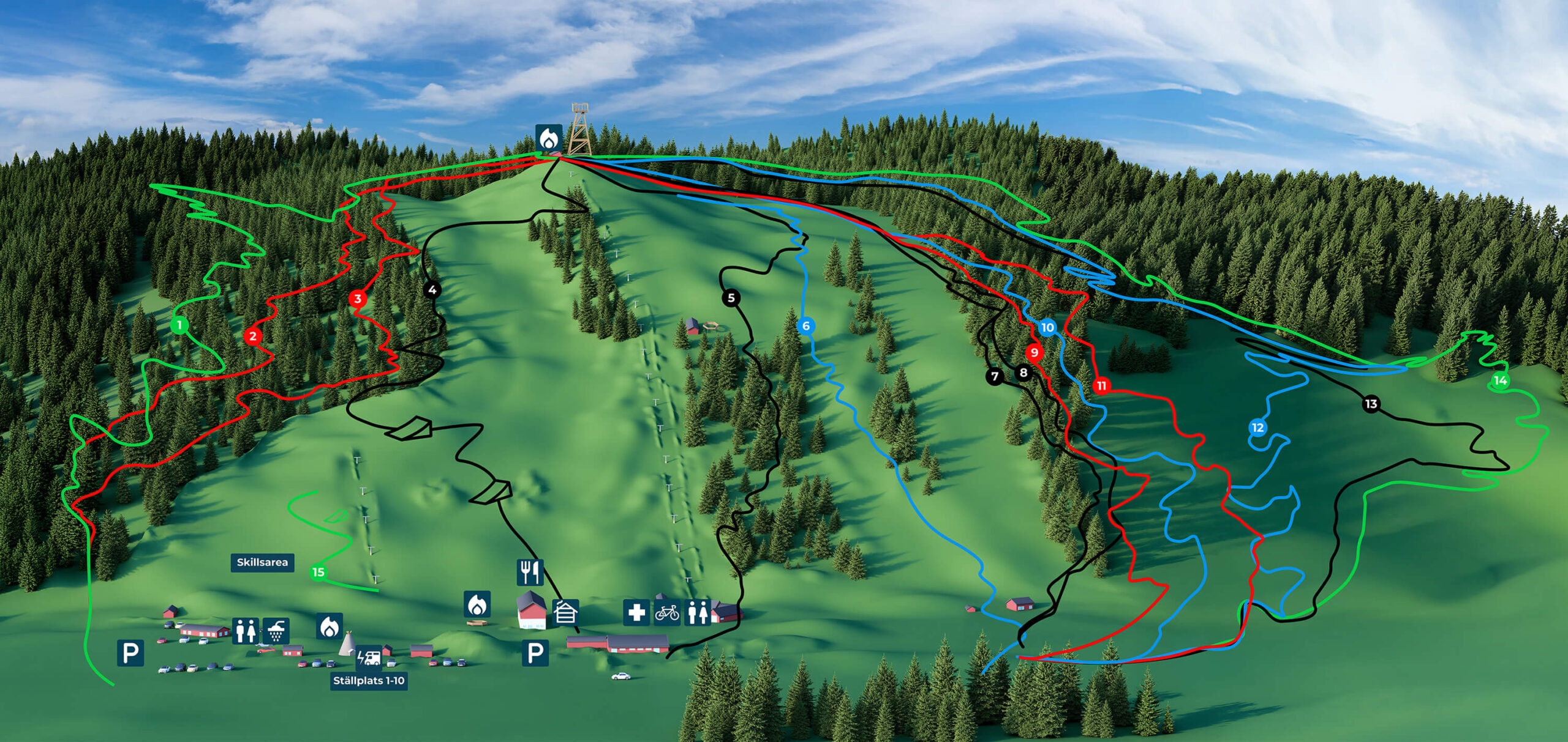 Vårt motto är cykling för alla. Oavsett om du är ute efter snabba flowtrails eller mer tekniska utmaningar finns något för dig hos oss. Vi har designat parken på ett sätt som ska göra det roligt och utmanande för alla som kommer till oss för att cykla downhill. Våra cykelleder är byggda för att ge både nybörjare och erfarna åkare en rolig och utvecklande upplevelse – med variation, fart och kontroll i varje åk. Utforska våra leder här.